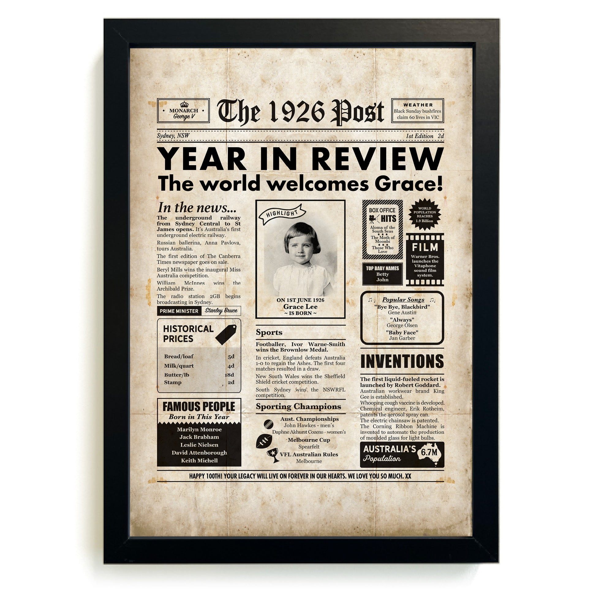 This vintage-style personalised newspaper poster brings the world of 1926 to life with headlines and facts from the year your loved one was born. More than a keepsake, it’s a way to spark conversations and share memories across generations—turning a 100th birthday into a celebration of stories, laughter, and connection.