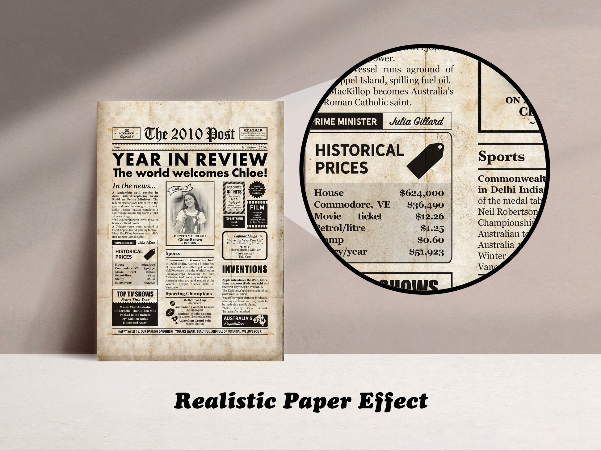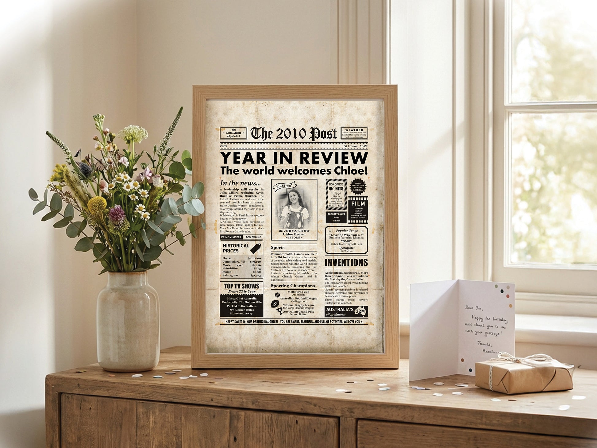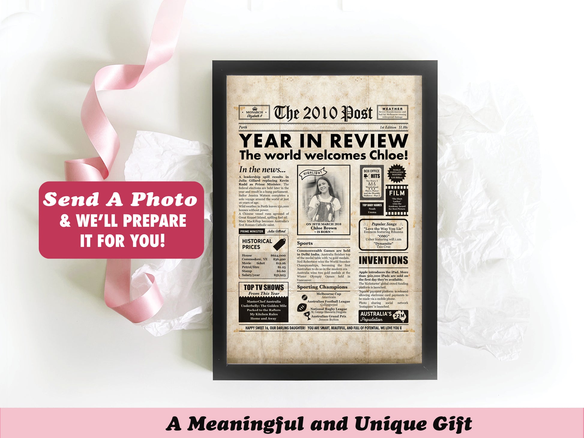 Celebrate your teen’s 16th birthday with a personalised 2010 newspaper-style poster featuring their photo and fun Aussie facts from the year they were born. A heartfelt digital keepsake that’s easy to print and perfect for sons or daughters turning sweet sixteen.