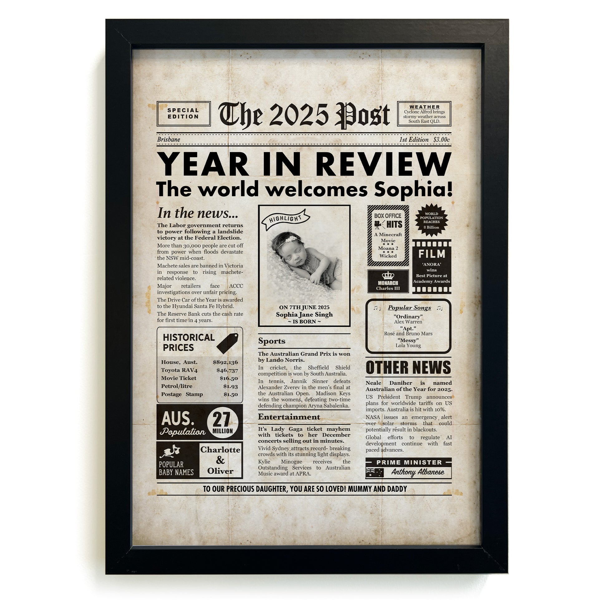 Create a lasting keepsake with a custom newspaper front page featuring the newborn's photo, birth details, and their name in the headline! With year to date Australian news stories and events, it's a timeless snapshot of history and heart that can be treasured for a lifetime.