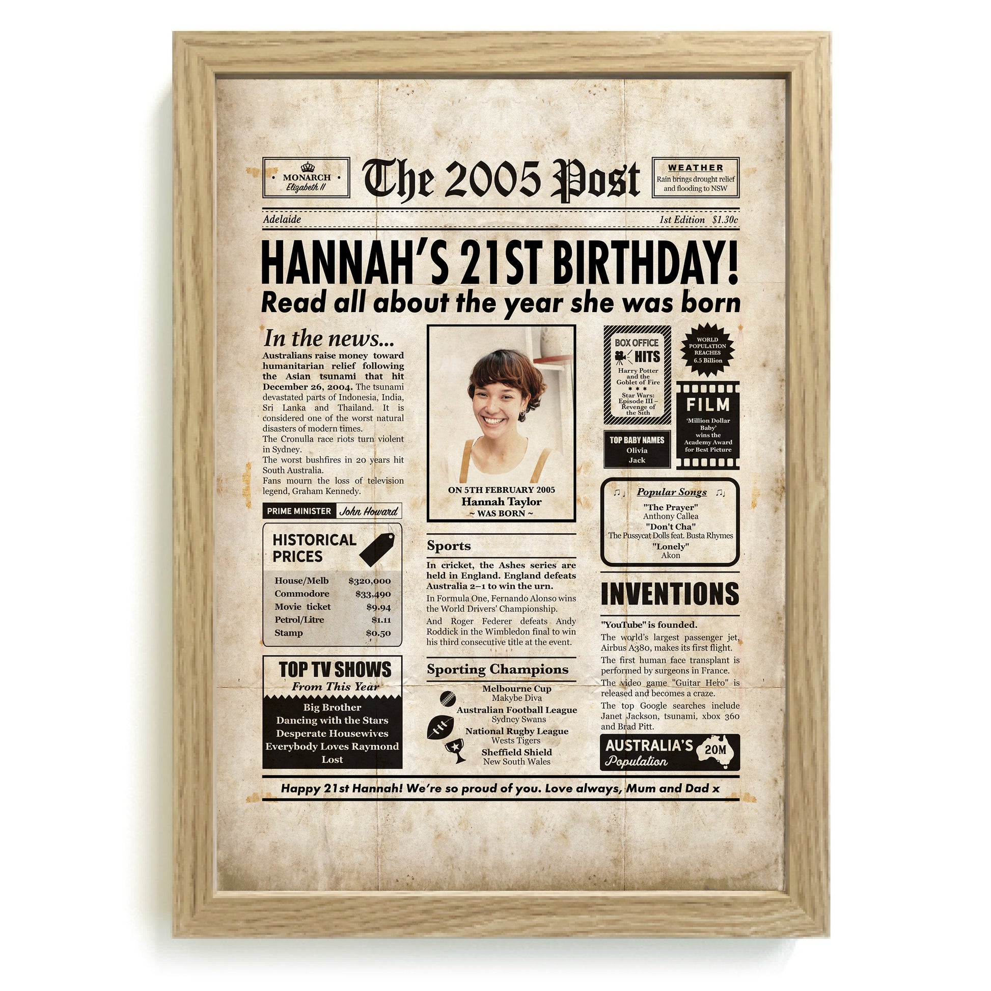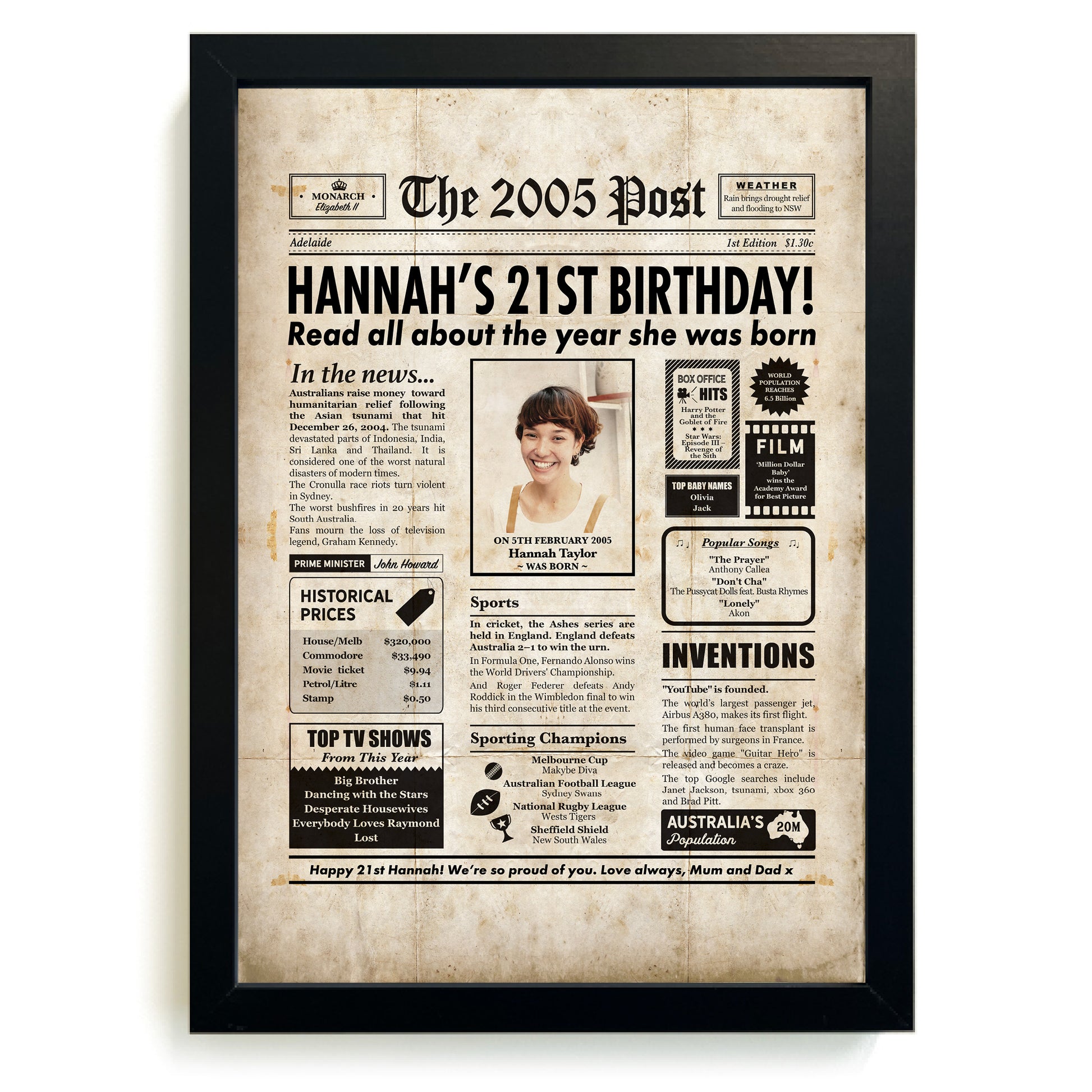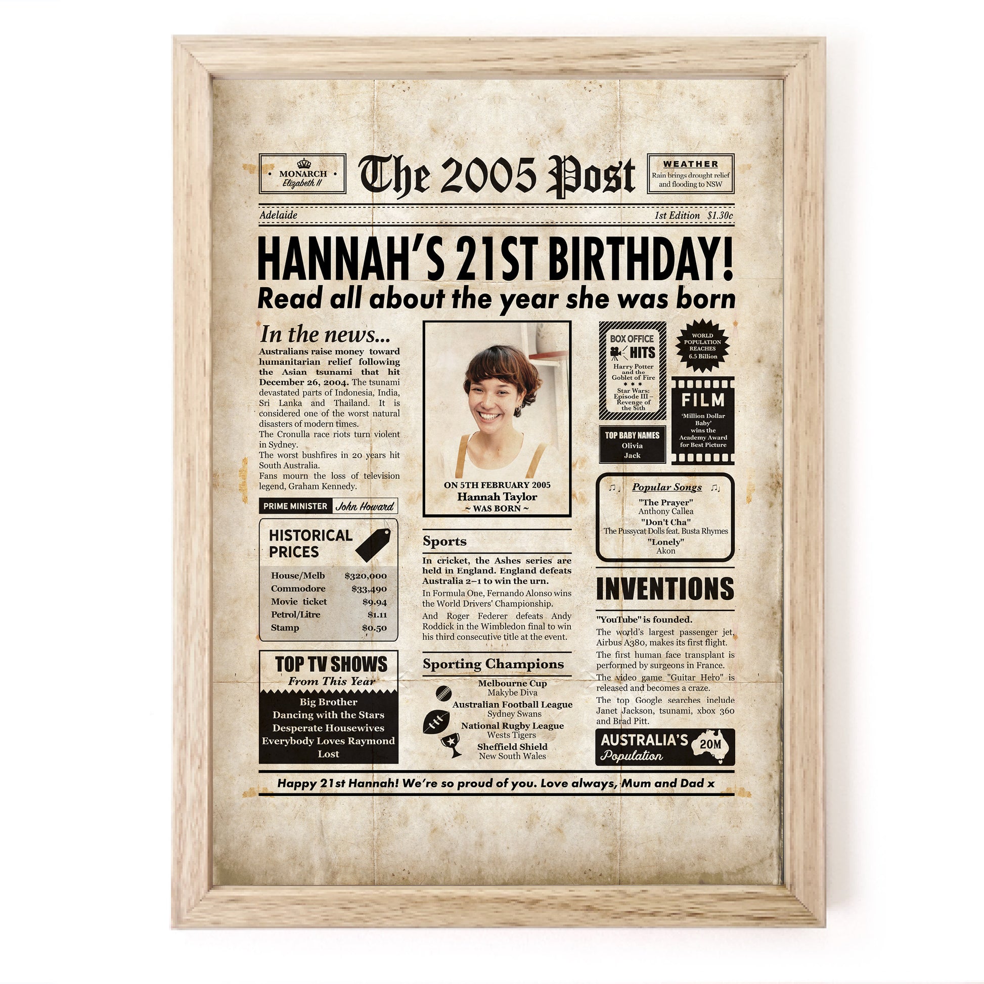 Make their 21st memorable with a personalised newspaper, bursting with pop culture and news highlights from 2005! Packed with iconic moments, music hits, movie releases, and your own personal message, it’s a time capsule of fun and nostalgia. Perfect for honouring milestones with a playful twist—because every birthday deserves a splash of entertainment and memories to cherish!