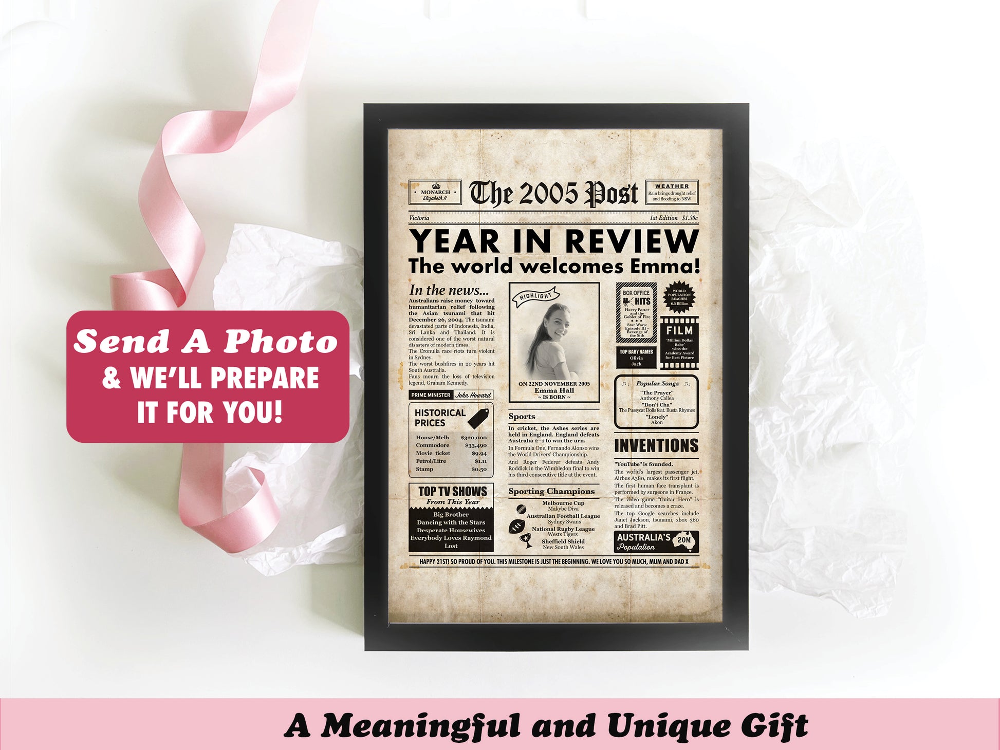The newspaper features a photo of the birthday person alongside news and fun facts from 2005, the year they were born.