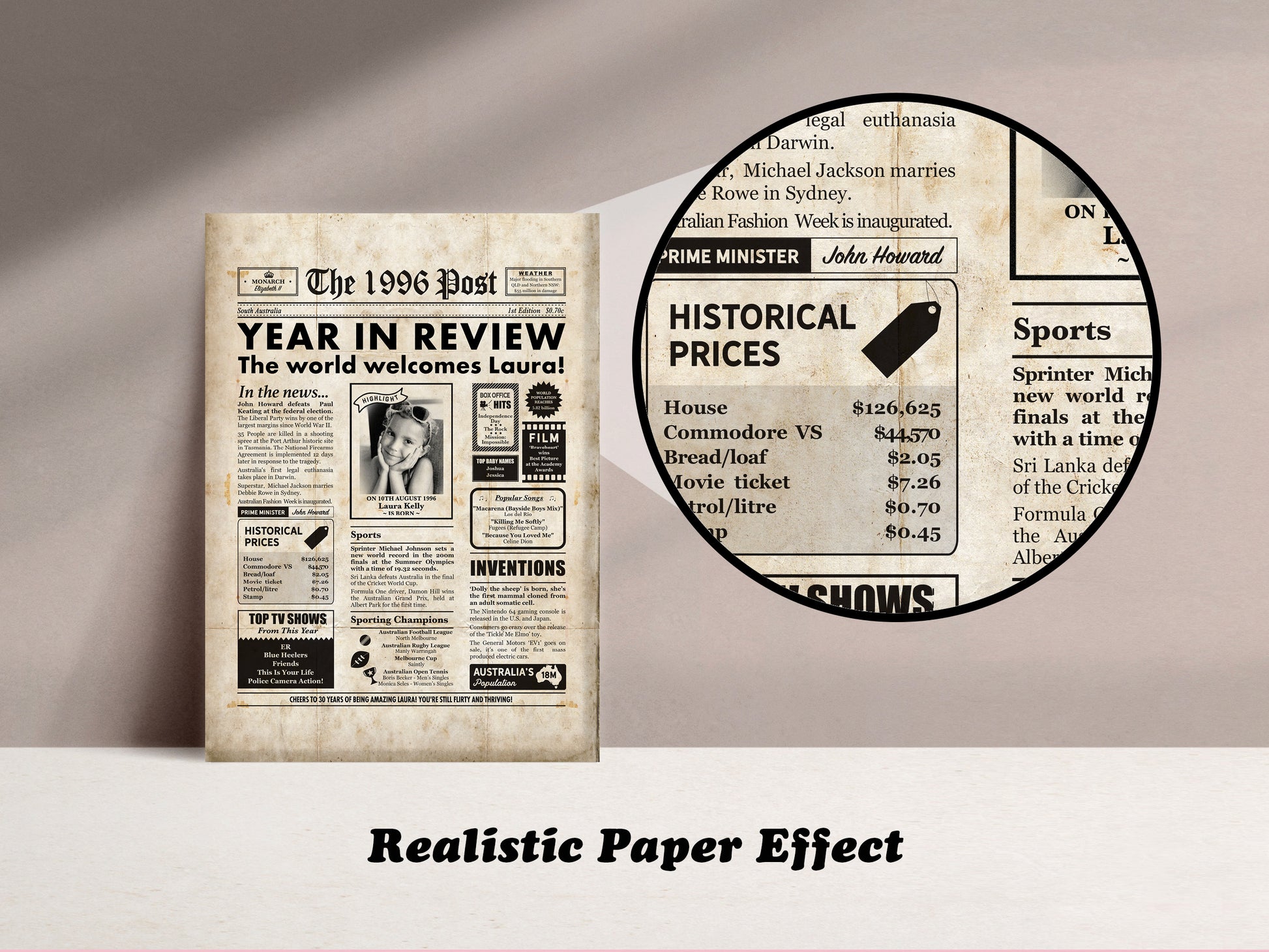 Looking for a cool and unique 30th birthday gift that stands out? Our digital 1996 Australian newspaper poster is the perfect pick!