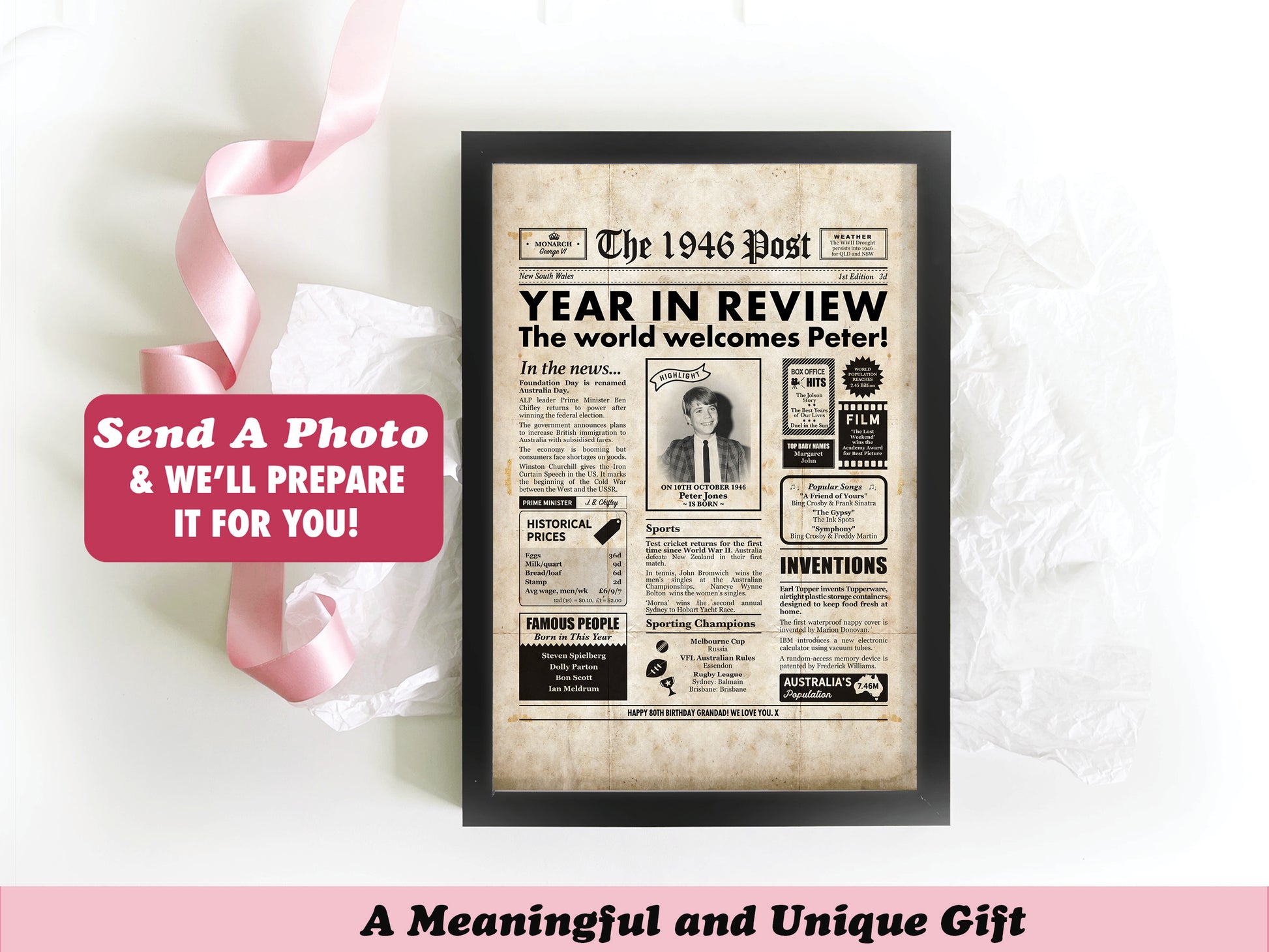 Our nostalgic 80th birthday poster features a photo of the birthday person alongside news and historical facts from 1946, the year they were born.