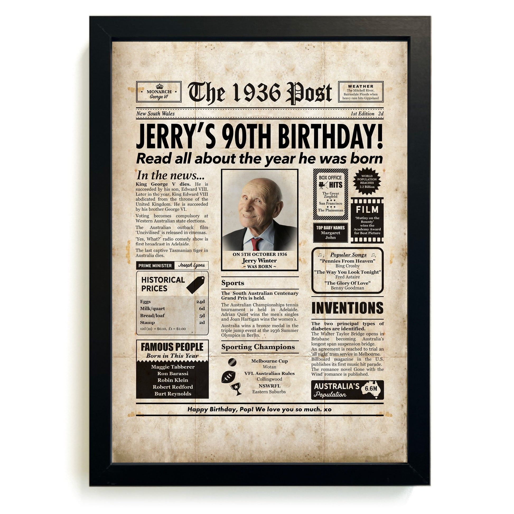Step back to 1936 with a beautifully personalised colour photo newspaper. Featuring Australian news, fun facts, and the birthday person's photo, it’s a nostalgic keepsake that sparks memories, stories, and heartfelt conversations.