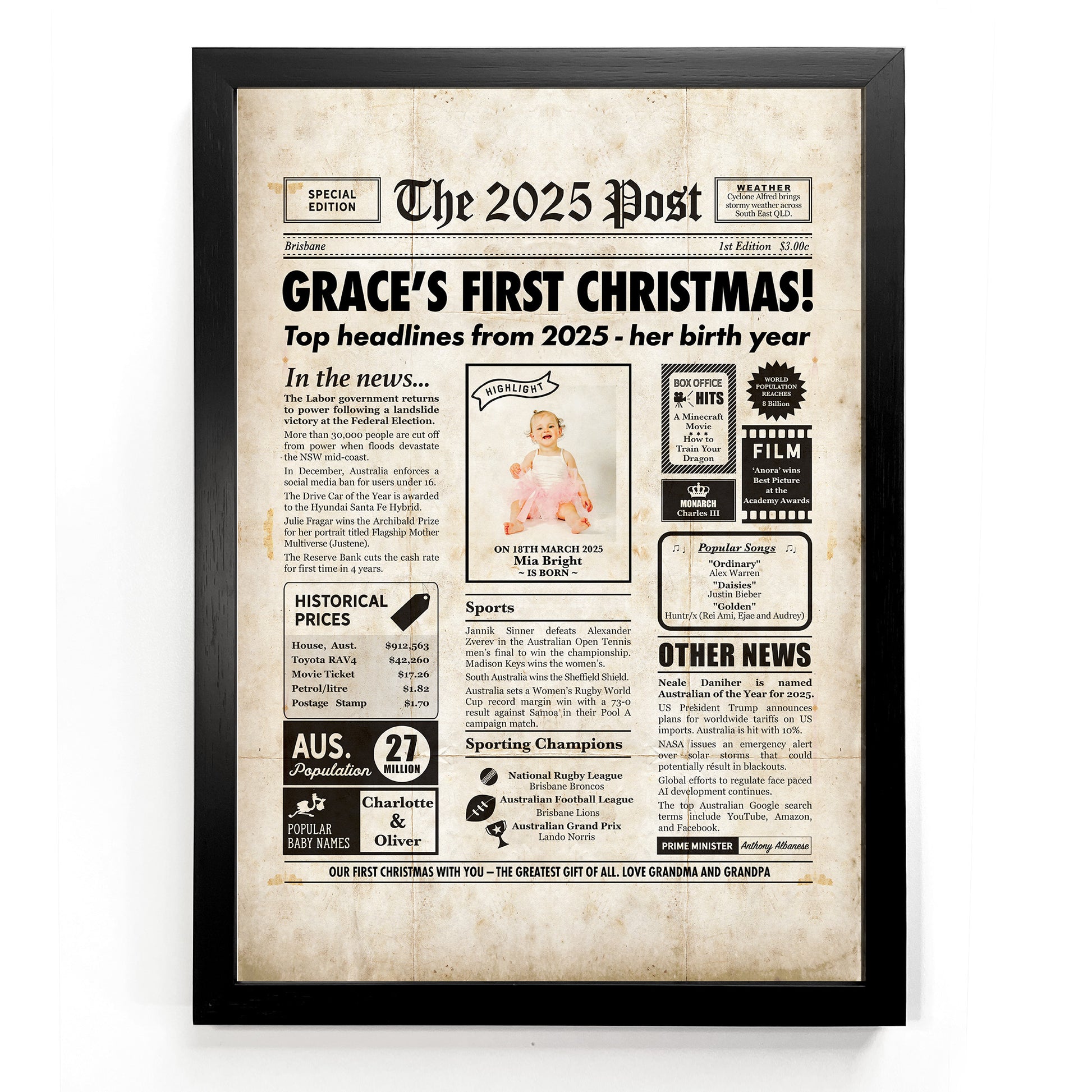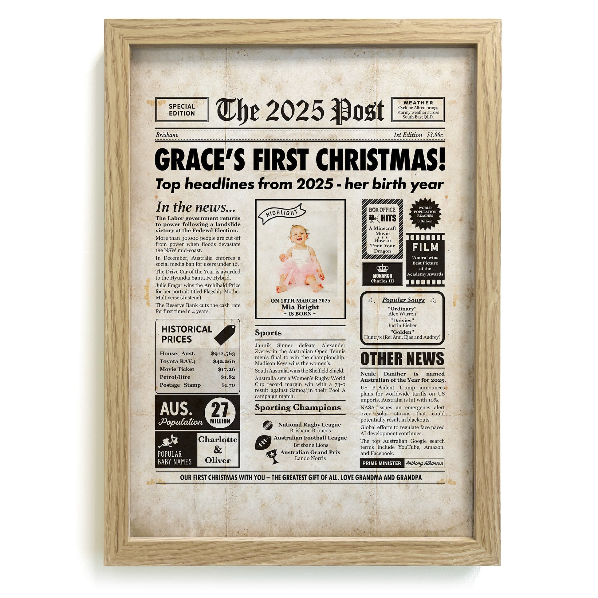 Mark this magical milestone with a beautifully designed First Christmas Personalised Newspaper Print. Styled like a nostalgic front page, this custom artwork features your baby’s name, photo, and your own personal message along top Australian news, events and fun facts from 2025 - the year they were born!