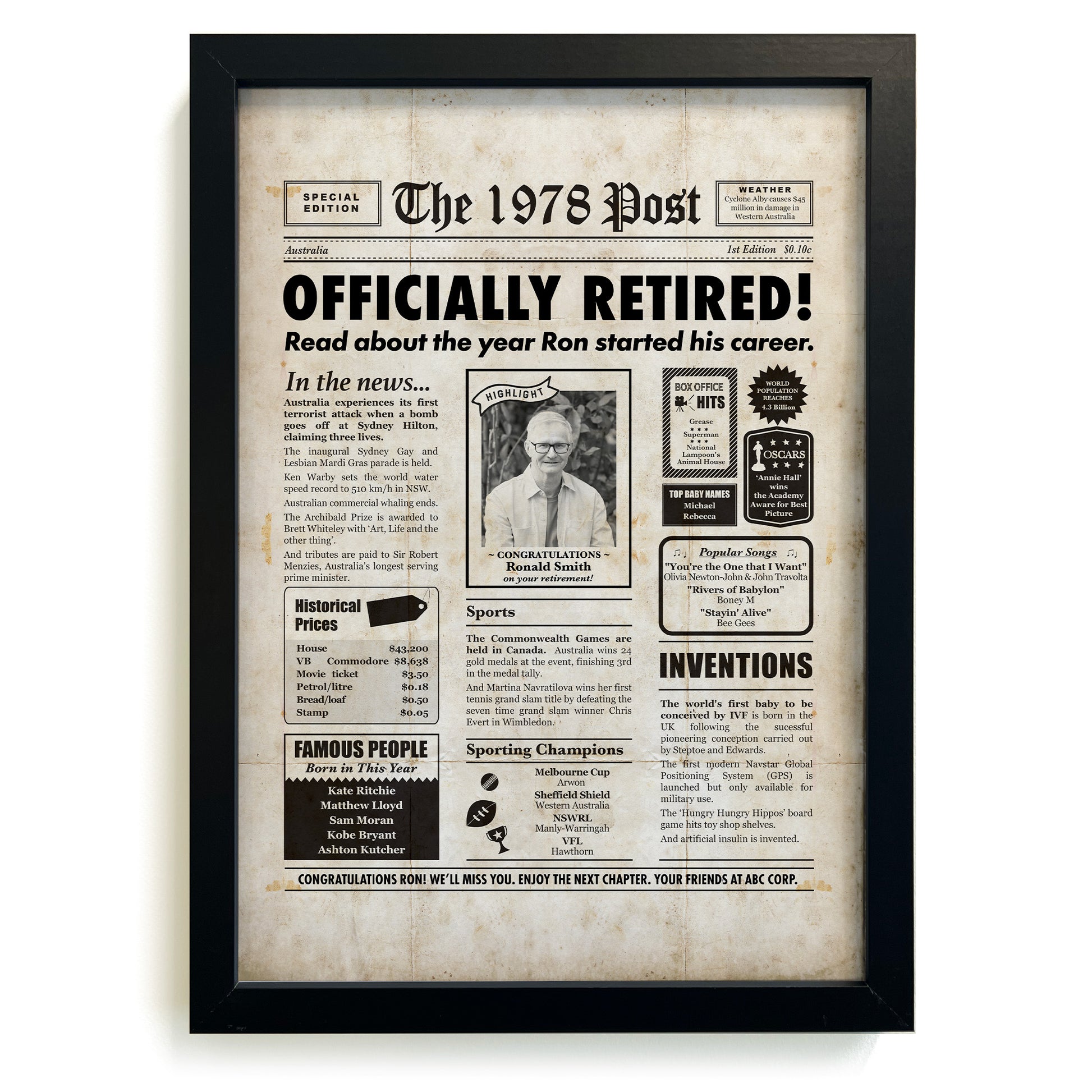 I am absolutely thrilled with the way my product turned out. It’s for my Brorhers 50th and looks amazing. It’s beautifully framed and genuine care was taken with packaging as well. Natalka went through all the minor adjustments I needed and very quickly too. Postage was also fast. I highly recommend going through Milestones Studio, if this is what you’re looking for. Thankyou Natalka.