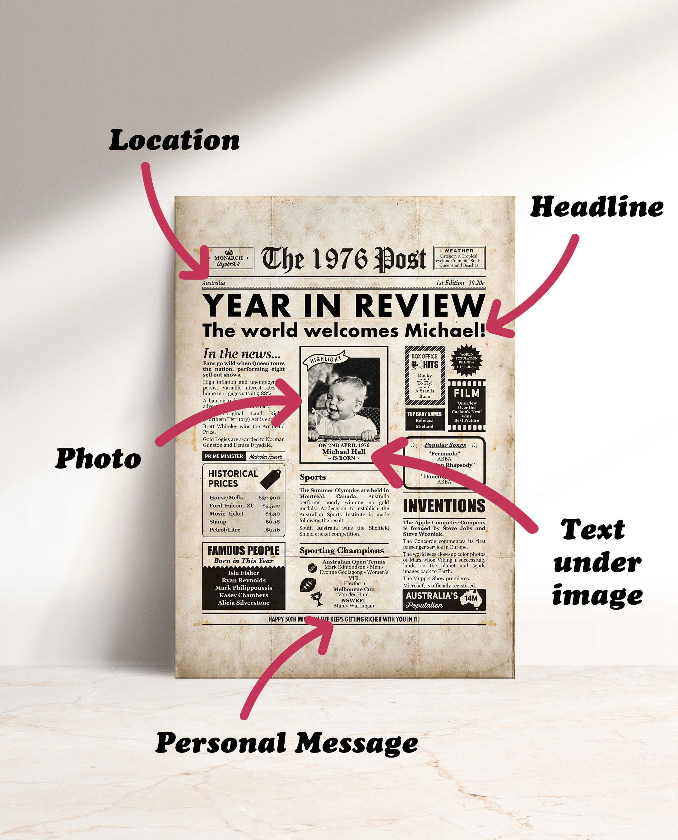 Our personalised milestone birthday newspaper is the perfect keepsake to celebrate someone special. Designed to look like a vintage front-page newspaper, this custom poster is filled with fun facts, historical events, and major news headlines from the year they were born.